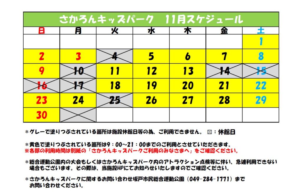さかろんキッズパーク11月度営業カレンダー